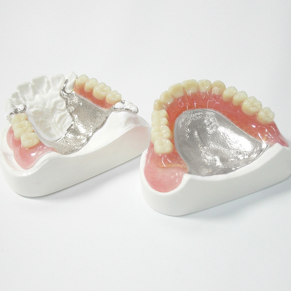 入れ歯の内側(歯肉に触れる部分)を、プラスチックに代わってチタンやコバルトクロムなどの金属で作っている入れ歯です。薄さと強度を併せ持ち、床などに落としてしまっても、簡単に割れてしまう心配がございません。また、熱伝導率が高いので、食べ物の温度を感じやすく、美味しく食事をすることができます。
